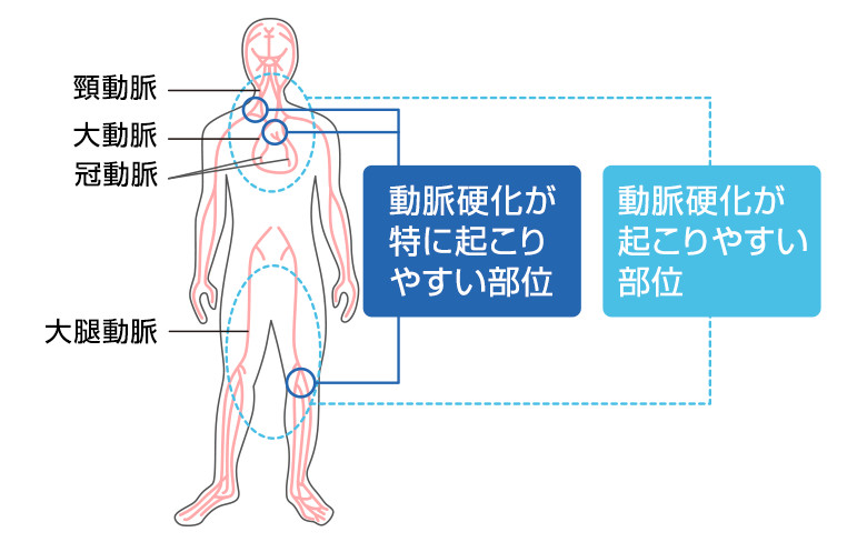 それらのことが重なって、脳や心臓などの太い動脈に、血管が硬くなる「動脈硬化」が見られるようになります。